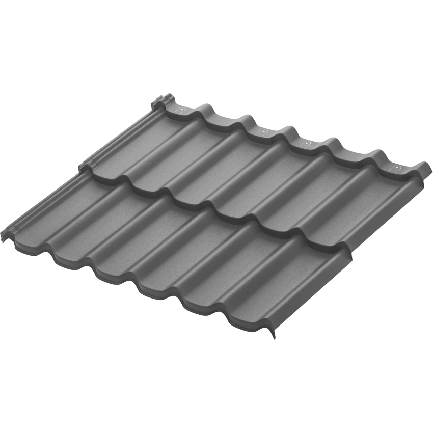 Металлическая модульная черепица Стокгольм XXL. Ключевым преимуществом металлической модульной черепицы AQUASYSTEM является скрытое крепление листов к обрешетке, что позволяет добиться непревзойдённой надёжности кровли и повышенной эстетики. Отличительной особенностью модульной черепицы являются стандартные размеры листов длиной в 2 модуля по 400 мм, что даёт колоссальные преимущества при хранении и транспортировке поддонов с черепицей. Имеет максимальную защиту от коррозии (первый класс цинкования) и повышенную УФ-стабильность. Гарантия 50 лет.