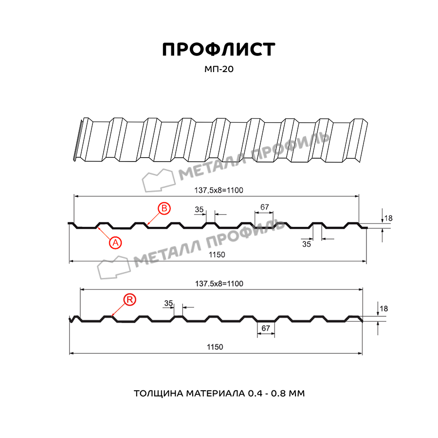 Этот профлист изготовлен из высококачественного металла и имеет профиль МП-20. Толщина листа составляет 0,5 мм, что обеспечивает прочность и долговечность изделия.